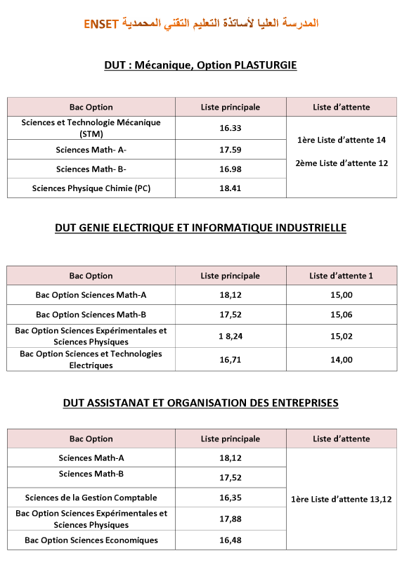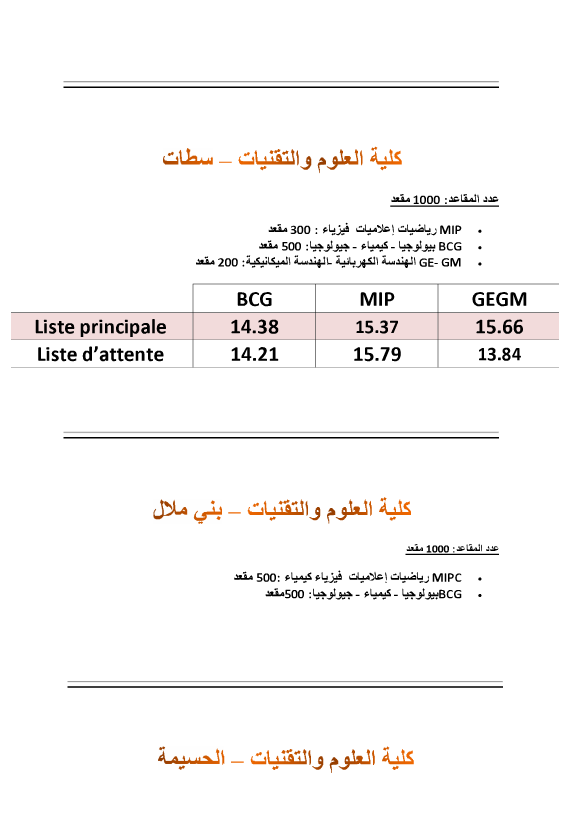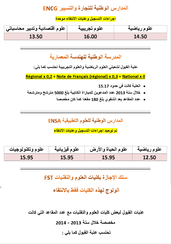 عتبات الولوج لبعض مؤسسات الدراسة بعد الباكالوريا للموسم 2014-2013 : ENCG – ENSA – ENSAM – - ISIC – FMP – FMD – ISTP – ISPM – DUT – FST وغيرها من المدارس العليا بالمغرب لفائدة تلاميذ الباكلوريا.